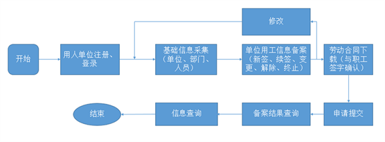 (1)用人单位注册 用人单位访问云南省劳动关系管理网上申报大厅系统网址,登录页点击注册,填写相关信息及上传相关照片,点提交,待劳动用工备案业务经办机构用户审批通过成功收到手机短信提示后,用人单位可以凭用户名及初始密码先激活后登录系统。 (2)基础信息采集 包括单位基本信息维护、单位部门基本信息维护、人员基本信息维护、人员新增、单位用工信息。 (3)单位用工信息备案 待基础信息采集完成后,进入单位用工信息备案模块,该模块包括合同新签备案、合同续签备案、合同变更备案、合同终止/解除备案。 (4)申请提交 待单位用工信息备案完成后,进入申请提交模块,该模块对合同进行批量提交,提交后,等待劳动用工备案业务经办机构用户反馈备案结果。 (5)备案结果 此处,提供备案结果查询,单位用户可根据备案月份查询备案结果。 (6)信息查询 该模块包括新参保花名册查询(报表用于参保)、劳动合同下载(用于与劳动者签订纸质合同)、新招职工花名册、劳动用工登记名册查询(报表提供给经办机构用户)。 2、主要业务流程(1)新签:点击菜单“单位用工信息备案-合同新签备案”。